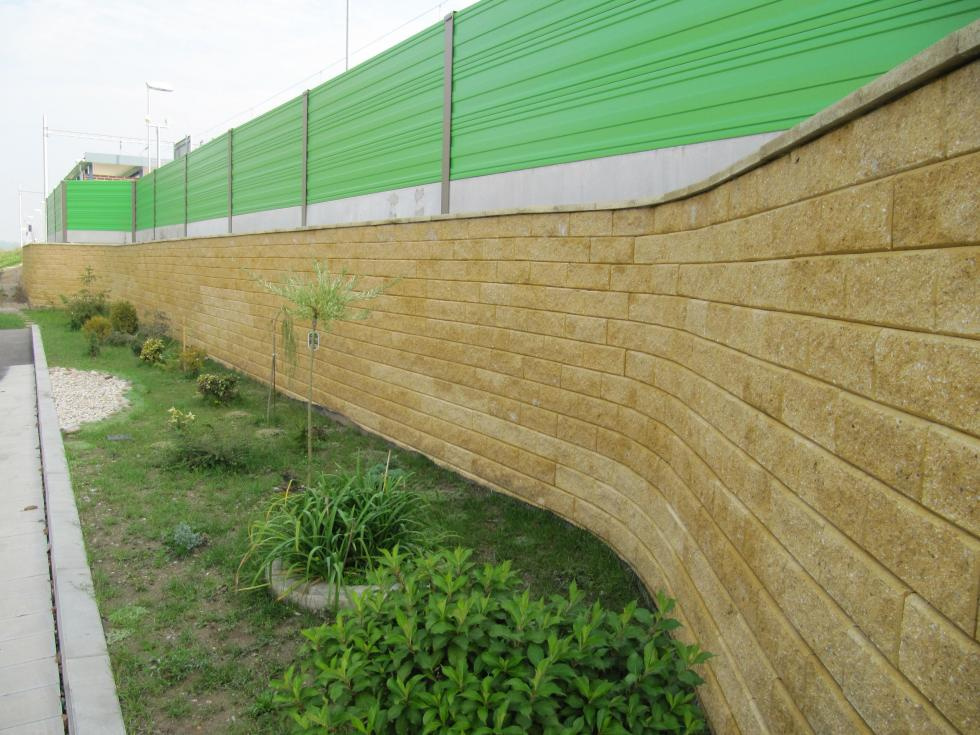 Certifikovaný oporný systém GEOMUR® – TW1 je zložený z tvaroviek TW1, modrého spojovacieho konektora a tuhých monolitických jednoosových HDPE geomreží Tensar typ RE500. Tvarovky s rozmermi 400 x 210 x 150 mm (D x Š x V) sa vyrábajú metódou vibrolisovania a štiepania betónu triedy C25/30. Pri tomto objekte bol odtieň tvaroviek TW1 žltý. Pre uchytenie geomreží a tvaroviek slúži priebežný modrý konektor vyrobený z vysokohustotného polyetylénu (HDPE). Oporný múr bol ukončený tvarovkami Maclit. Po ukončení výstavby oporného múru boli realizované vrtné práce pre osadenie protihlukovej steny a prístreškov.